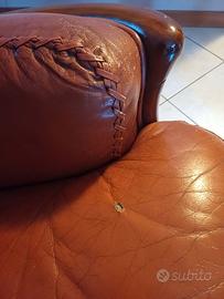 La struttura è perfettamente integra e solida. La pelle presenta naturali segni del tempo, compatibili con l’età dell’oggetto, che ne valorizzano l’autenticità. È presente solo un piccolo foro sulla seduta (come visibile in foto).