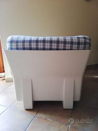 Vendo usata ma in buono stato poltrona con braccioli in plastica robuta bianca con cuscini sfoderabili. Misura cm L 80 x P 90 h 80 Seduta h cm 40 Preferibile ritio a mano.