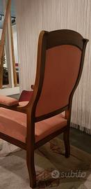 Questa poltrona in stile, con struttura in legno e braccioli completamente imbottiti.