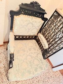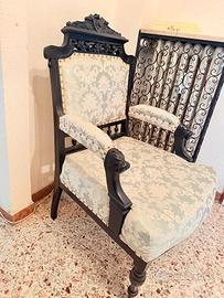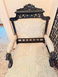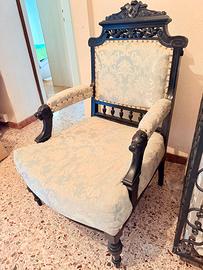 Poltrona in legno nero in perfette condizioni,. Rivestimento in ottime condizioni. Molto antica. Misure: 65 cm di larghezza x 65 cm di lunghezza x 113 cm di altezza. Arredamento antico, retrò e vintage.