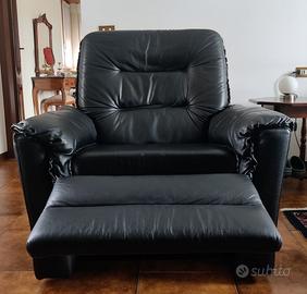 Vendo comodissima poltrona il pelle nera reclinabile con un semplice e agevole movimento meccanico non elettrico. La poltrona è stata prodotta negli anni '80 è in condizioni perfette, il meccanismo che da la possibilità di arrivare ad una posizione semisdraiata funziona senza alcuna difficoltà, e la pelle del rivestimento è come nuova. Le dimensioni sono Larghezza 96 cm., profondità 85 cm., altezza schienale 100 cm., seduta altezza 45 cm., distesa come in foto raggiunge una lunghezza di 165 cm.