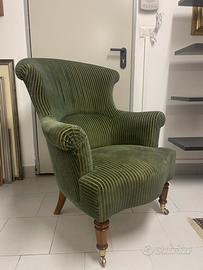 Poltrona inglese antica in velluto, legno e ottone con due ruote.