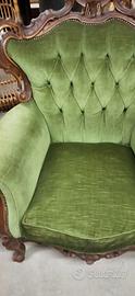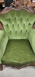 Poltrona artigianale imbottita in velluto verde adatta in diversi ambienti.