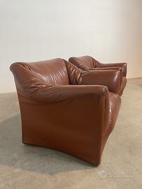 Questa coppia rara è rivestita in pelle pieno fiore color Rosso Siena (codice Cassina “Rosso Antico”), una nuance calda e avvolgente che oscilla tra bordeaux intenso e terracotta luminoso, ideale per spazi vivaci o intimi.