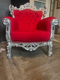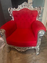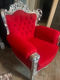 Poltrona rossa in velluto e particolari in legno intarsiato color argento