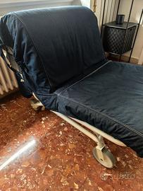Poltrona letto Vansta blu con ruote, si trasforma rapidamente e facilmente in un letto confortevole e spazioso. Materasso in poliuretano espanso di durezza media. Rivestimento sfoderabile. Praticamente senza uso. Dimensioni: Larghezza: 80 cm Profondità: 110 cm Larghezza sedile: 80 cm Profondità sedile: 70 cm Altezza seduta: cm 46 Altezza: 88 cm Larghezza letto: 80 cm Lunghezza letto: 205 cm Cosa è incluso: Struttura per poltrona letto, materasso, fodera e cuscino blu. Cosa NON è incluso: coperta e cuscinetto grigio. In ottimo stato, senza difetti. Ritiro in loco, zona Tuscolana, ROMA
