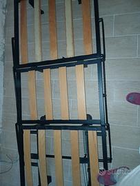materiale robusto, rete con doghe sistema di facile apertura. Misure 85 * 95 altezza del letto circa 40 cm. struttura materassi e copertura come nuovi
