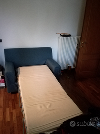 Poltrona letto pieghevole H cm 85 Largh. cm 124 , usata pochissimo come letto, con doghe in legno ( letto e meccanismo pari al nuovo) nella parte anteriore, come da foto VISIBILI UNGHIATE Di GATTO, necessita eventualmente un coprivano.
