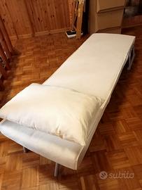 -POLTRONA LETTO: poltrona letto con schienale regolabile in cinque posizioni completa di cuscino, colore bianco panna. Ribaltando i braccioli e parte dell’imbottitura si allunga e diventa lettino. Nello schienale sono predisposti due piedi per quando è letto. Misure: Lunghezza 180 cm, Larghezza 60 cm, altezza letto 23 cm (altezza seduta 34 cm), peso circa 18 kg.