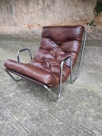 Poltrona lounge "Californian" in pelle marrone e acciaio cromato. design Jacques Charpentier per Roche Bobois Misure 77x88xh82cm