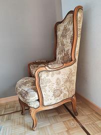 Poltrona in noce, in stile Luigi XV, del 1950, schienale sagomato, braccioli in parte imbottiti su montanti sagomati, gambe arcuate ornati da fiori, rivestimento in tessuto operato a fiori monocromi in parte usurato dal tempo