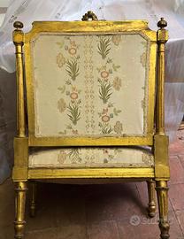 Raffinata poltrona in pieno stile Luigi XVI, splendido esempio di ebanisteria neoclassica. L'oggetto si distingue per l'eleganza delle linee e la ricchezza degli intagli, ideale per arredamenti di prestigio, studi professionali o saloni di rappresentanza. Caratteristiche principali: Struttura: Legno finemente intagliato a mano con motivi a torchon e rosette sui dadi di raccordo. Finitura: Interamente dorata a foglia d'oro con bellissima patina del tempo. Schienale: Modello "en cabriolet" sormontato da una cimasa decorata con fiocco e ghirlanda fiorita. Sostegni: Gambe troncopiramidali scanalate, tipiche del periodo, che conferiscono slancio e stabilità. Rivestimento: Pregiato tessuto in broccatello di seta a motivi floreali verticali. Stato dell'oggetto: La struttura lignea è solida e integra. La doratura è originale e presenta il fascino del vissuto. Il tessuto è d'epoca e coordinato; segnalo la presenza di alcune macchie da umidità/tempo sulla seduta (come da foto), che ne suggeriscono una pulizia professionale o una parziale ritappezzeria per riportarla allo splendore originario. Dimensioni L 70 H 85 P 55