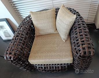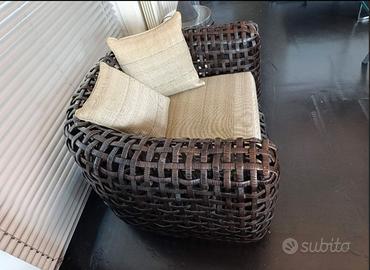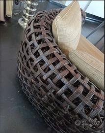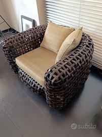 POLTRONA IN LEGNO MASSELLO INTRECCIATO PATINATO A MANO, CON CUSCINI SFODERABILI