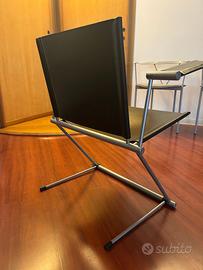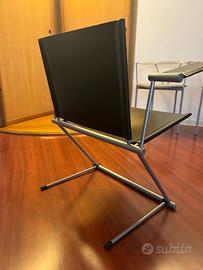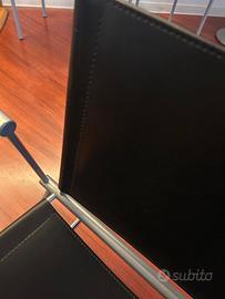 Marchio: Matteo Grassi Modello: Ballerina Design/One: Herbert Ohl La poltrona Ballerina incarna l’eleganza leggera e scultorea tipica del design di Matteo Grassi dei primi anni ’90. Ideata da Herbert Ohl, si distingue per la silhouette sottile e l’equilibrio geometrico raffinato, evocando il movimento delicato e la tensione armoniosa suggeriti dal nome stesso. La struttura in grigio laccato definisce una cornice pulita e architettonica. Le linee essenziali trasmettono leggerezza visiva senza compromettere la solidità strutturale. Il profilo metallico minimalista sottolinea il carattere contemporaneo della poltrona, permettendo di integrarla con eleganza in ambienti residenziali e contract. Sedile, schienale e braccioli sono rivestiti in cuoio nero, materiale iconico della produzione di Matteo Grassi. Il cuoio introduce calore e ricchezza tattile, creando un sofisticato contrasto con la struttura laccata e valorizzando la forte identità grafica della poltrona. Equilibrata nelle proporzioni e curata nei dettagli, Ballerina è perfetta come poltrona da salotto, come seduta in sala riunioni o come elemento di carattere in un ambiente raffinato. Finiture: Struttura: Grigio laccato Sedile, schienale e braccioli: Cuoio nero di selleria Dimensioni: L 74 × P 40 × H 73 cm Altezza sedile: 42 cm Concetto: Leggera e architettonica, Ballerina rappresenta la sintesi tra precisione industriale e lavorazione artigianale del cuoio. La silhouette elegante e il contrasto dei materiali ne fanno un’icona discreta del design italiano contemporaneo.