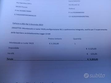 vendo poltrona montascale per disabili usata pochissimo, BATTERIA DA SOSTITUIRE,per il resto in ottime condizioni,corredata da fattura di acquisto 3250e ,libretti istruzioni e carica batterie.