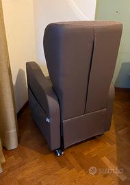 Poltrona alzapersone motorizzata in ecopelle colore marrone; minimo ingombro e ottima manovrabilita’ su rotelle con blocco. Telecomandata. Seduta reclinabile e alzata del poggiapiedi. Funzione alzapersona. Presidio medico. Ottimo stato; usata pochissimo.
