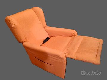 Comodissima poltrona per anziano o disabile, ampia seduta di 50 cm. di larghezza, colore ocra. Due motori per favorire il movimento di alzata e per disporre schienale e poggiapiedi fino alla posizione sdraiata, pannello di controllo. Fodera esterna lavabile.