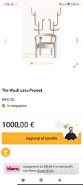 "The Wash Less Project, ispirato alla comune sedia da camera dove spesso si accumulano i vestiti prima di essere ordinati, è ideato con un occhio alla sostenibilità. Progettato da Fabio Novembre e prodotto da Natuzzi, non è solo una sedia, è un oggetto di design funzionale e esteticamente attraente. Incorpora materiali sostenibili e tecnologia avanzata, con una struttura in acciaio durevole e un rivestimento in Ecoplen®*, un tessuto autopulente** brevettato realizzato con bottiglie PET riciclate che purifica l'aria ed elimina gli odori. La sedia può essere usata anche come servo muto con una struttura scultorea che si estende dallo schienale, fungendo da appendiabiti e che rilascia nanoparticelle di TiO2 igienizzanti per pulire le fibre dei tessuti. Il rivestimento in Ecoplen® bianco caldo, facile da pulire, include lo slogan ricamato ""Wash Less"", che promuove abitudini sostenibili e consapevoli. Questa poltrona, impreziosita con supporti in acciaio verniciato floccato, simboleggia un impegno verso la consapevolezza ambientale. *Ecoplen è un marchio registrato nell'Unione Europea, di proprietà di Francisco Pérez Las (CEO di Atenzza Outdoor SL), con numero di applicazione 018868501. Prodotto da Atenzza Outdoor SL, una società spagnola che produce tessuti tecnici per rivestimenti interni/esterni. Ecoplen® è un marchio di Atenzza Outdoor che si riferisce al tessuto che si auto-pulisce (se la macchia ha origine organica) e si auto-disinfetta (funghi, batteri e virus). **Riferito a macchie organiche. Le macchie organiche vengono rimosse semplicemente esponendo il tessuto alla luce solare; il processo di pulizia richiede circa 10 giorni. Il tessuto dovrebbe essere esposto direttamente al sole per 48-72 ore per risultati ottimali, con una esposizione raccomandata di 10 giorni per la rimozione completa. "