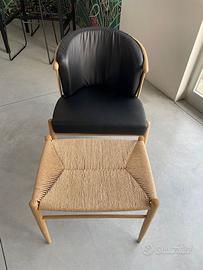 Poltrona in stile scandinavo realizzata in massello di rovere grezzo, schienale e seduta in ecopelle nera, completa di pouf in massello di rovere grezzo impagliato a mano in cordoncino