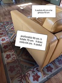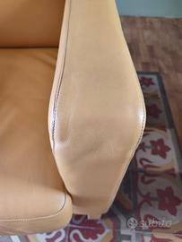 poltrona in pelle color senape. usata ma in ottimo stato, cuscini perfetti. qualche segno di usura sulle cuciture dei braccioli. piedini quadrati in legno molto chiaro. vendo per cambio con divano e non ho più spazio.