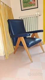 Poltrona con rivestimento in ecopelle blu, struttura in legno, schienale reclinabile. Dimensioni: L63cm, P62cm