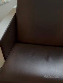 La poltrona é rivestita in pelle marrone (schiena e seduta) e in pelle color burro (braccioli).