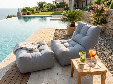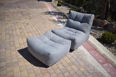 Vendo bellissime poltrone relax complete di pouf coordinato, ideali sia per arredare la casa che per il giardino o il bordo piscina. CARATTERISTICHE: Comodità: L'interno è realizzato con un mix di fiocco, poliuretano e perle di polistirolo per garantire il massimo comfort e durata. Tessuto: Il modello in foto è in tessuto "Couture", molto bello e resistente" Personalizzazione: Possiamo realizzarle in altri colori diversi. Uso esterno: Disponibile anche con tessuti specifici per l'esterno (resistenti al sole e all'umidità). La poltrona e il pouf sono stati creati in laboratorio da tappezzieri esperti, comodi ed ergonomici , non perdono la propria forma grazie al mix di imbottitura. Design moderno e seduta super accogliente. Per informazioni su colori disponibili, prezzi, contattatemi in privato!