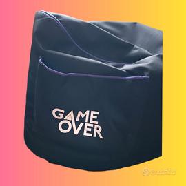 Poltrona+pouf da gaming della Game Over resistente all' acqua. Dotata di tasca laterale utile per riporre oggetti e cinghia porta cuffie.