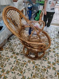Poltrona in rattan/vimini stile Peacock vintage anni ’70. Struttura solida, design molto decorativo con schienale alto e braccioli curvi. Ideale per arredamento boho, terrazzo o angolo relax. Condizioni buone con normali segni del tempo (come da foto). Da sistemare qualche listello sulla seduta Prezzo 130 Ritiro a mano villaggio Costaraba Montepaone Lido. ( Catanzaro)