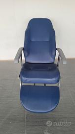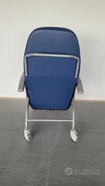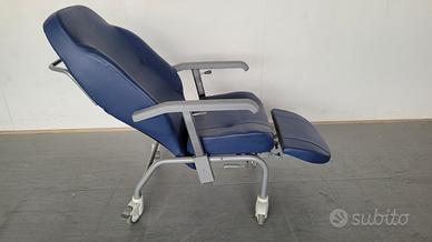 Poltrona reclinabile con ruote in pelle color bluette. Ideale per persone con problemi di deambulazione, molto comoda e maneggevole. Grazie alle ruote grandi si sposta facilmente da un locale all'altro. usata pochissimo. Viste le dimensioni solo ritiro.