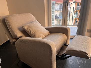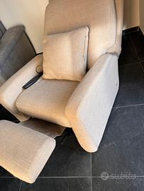 Poltrona poltrone sofa completamente sfoderavile, munita di cuscino abbinato in piuma d’oca. Ha il doppio motore per consentire di alzare la poltrana per agevolare l’alzata della persona e sdraiarla con alzapiedi.