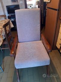 Poltrona reclinabile manualmente con due diverse posizioni in legno con due grandi cuscini rivestiti di stoffa ciniglia beige. No spedizione, la poltrona dovrà essere ritirata in Torino presso il domicilio che sarà indicato