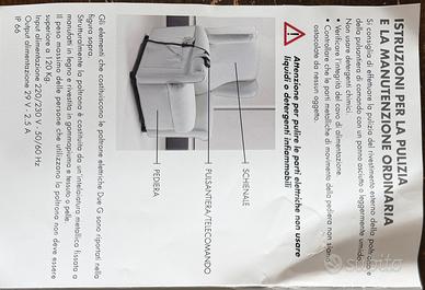 Vendo poltrona relax ideale per anziani o persone con ridotta mobilità, usata pochissimo ( meno di un mese) e in ottime condizioni. La poltrona è dotata di sistema alzapersona (lift) che accompagna il movimento per alzarsi in totale sicurezza e autonomia.