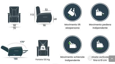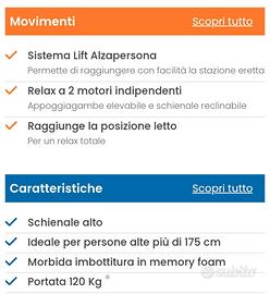 Vendesi poltrona relax alzapersona professionale, acquistata a maggio 2025 e praticamente mai utilizzata. L’oggetto è pari al nuovo, ancora in garanzia (si allega fattura d'acquisto originale di €990). Caratteristiche principali: Meccanica a 2 motori indipendenti: permette di regolare schienale e poggiagambe in modo autonomo fino alla posizione letto. Comfort assoluto: dotata di seduta antidecubito e doppia imbottitura per il massimo sostegno. Sistema Roller System: pratica leva a scomparsa per spostare la poltrona facilmente da una stanza all'altra su ruote. Comando semplice: telecomando ergonomico e intuitivo incluso. Per info contattare anche il seguente numero 3281781066 grazie