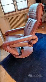 Poltrona relax dal design moderno, in vera pelle, colore viola, gira su se stessa a 360 gradi, molto robusta e confortevole.