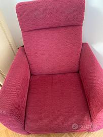 Poltrona relax manuale di Poltrone&Sofà. Meccanismo manuale di reclinazione dello schienale e contemporaneamente si alza il poggiapiedi. Misura 101x91x85. Tessuto molto elegante tipo velluto con motivo tono su tono in rilievo di colore rosso scuro, completamente sfoderabile. Condizioni perfette, no rotture o usura. In regalo i 2 cuscini di grandi dimensioni (50x50), morbidi e dello stesso tessuto. Euro 95.