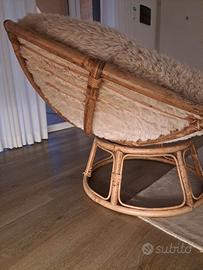 Poltrona rotonda in rattan naturale con cuscino in cotone beige + copricuscino in finto pelo