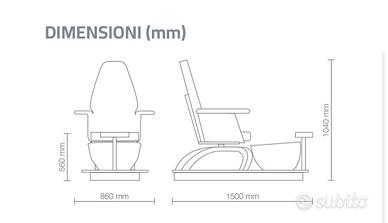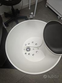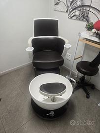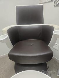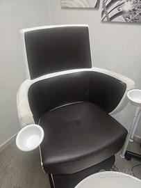 La poltrona Saint Barth è unica nel suo genere, ampia, ergonomica e confortevole. I braccioli e le relative vaschette removibili per manicure donano un maggior comfort alla cliente. La rotazione della seduta avviene a +/- 90 gradi per agevolare seduta e discesa. La vasca, dotata di miscelatore con doccino, è realizzata in materiale compatto bianco ed è facilmente igienizzabile. Necessita di allaccio alla rete idrica.