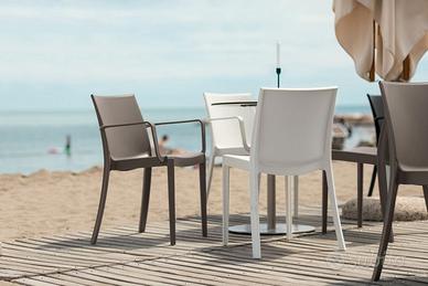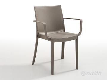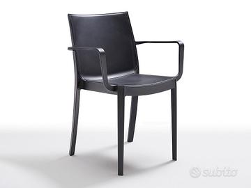 Sedia monoblocco impilabile in polipropilene, con braccioli e tappi antiscivolo. Finitura "matt". Resina riciclabile al 100%. Ideale per uso interno ed esterno.