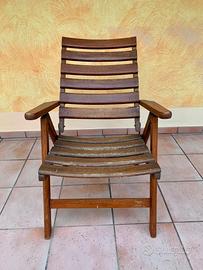 Sedia da giardino o terrazzo con braccioli regolabile e completamente ripiegabile in legno tipo teak trattato per gli esterni. La sedia è in ottime condizioni, ma avrebbe bisogno di una mano di impregnante, specialmente sulle doghe della seduta.