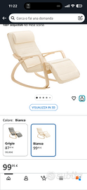 Poltrona a dondolo sfoderabile di colore panna. Comprata su amazon a 99€. Se cercate poltrona a dondolo trovate l’articolo e potete vedere bene tutte le caratteristiche. Già smontata e lavata montaggio molto semplice.
