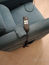 Poltrona Sofarm Relax, modello Calypso, perfettamente funzionante. Seduta memory. Elevabile con 2 motori il cui accoppiamento permette di ottenere più combinazioni di posizioni.Funzione alzapersona parallelo per facilitare il passaggio alla posizione eretta. Posizione letto. Pediera elettrica, Coprischienale e copriseduta, Poggiatesta. Cassetto a bracciolo. Roller system, meccanismo di sollevamento su quattro ruote indipendenti che può essere azionato grazie a una leva a pedale collocata nella parte posteriore della poltrona.