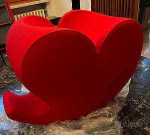Poltrona a dondolo a forma di cuore con imbottitura in poliuretano espanso schiumato a freddo ignifugo firmata da Ron Arad per Moroso. Soft Heart è una poltrona dal design eclettico e particolare, perfetto per arredare con un tocco pop e contemporaneo qualsiasi ambiente residenziale e commerciale. La struttura interna della poltrona è in acciaio. Il rivestimento, in tessuto rosso, è realizzato in fibra di poliestere.