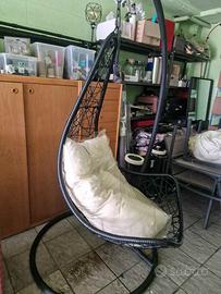 Vendo bellissima sedia sospesa a dondolo con struttura in metallo e intreccio in rattan sintetico, completa di cuscino imbottito color panna.