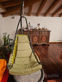 Poltrona sospesa Kasanova usata in ottime condizioni. Telaio in ferro grigio, seduta e cuscino verde. Tenuta sempre in appartamento e mai esposta alle intemperie.