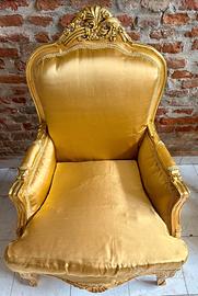 Vendo elegante poltrona in stile barocco, con struttura in legno intagliato e rivestimento in tessuto giallo oro.