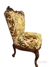 Struttura in legno intagliato dipinto in oro e imbottitura in tessuto damascato in tono. Da inserire in un salotto in stile moderno come elemento d'accento oppure da lasciare come unica protagonista in uno studio o in ingresso.