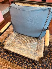 Il tessuto originale presenta segni di usura sia sui braccioli sia nella parte della seduta (coperta attualmente dal cuscino), come visibile in foto.