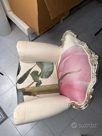 Elegante poltrona in stile Luigi XV con originale rivestimento decorato con stampa rosa e struttura in legno con finitura dorata.