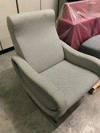 Poltrona dal design vintage anni '50 imbottita in poliuretano ad alta densità e rivestita in tessuto motivo vintage pied de poule blu.